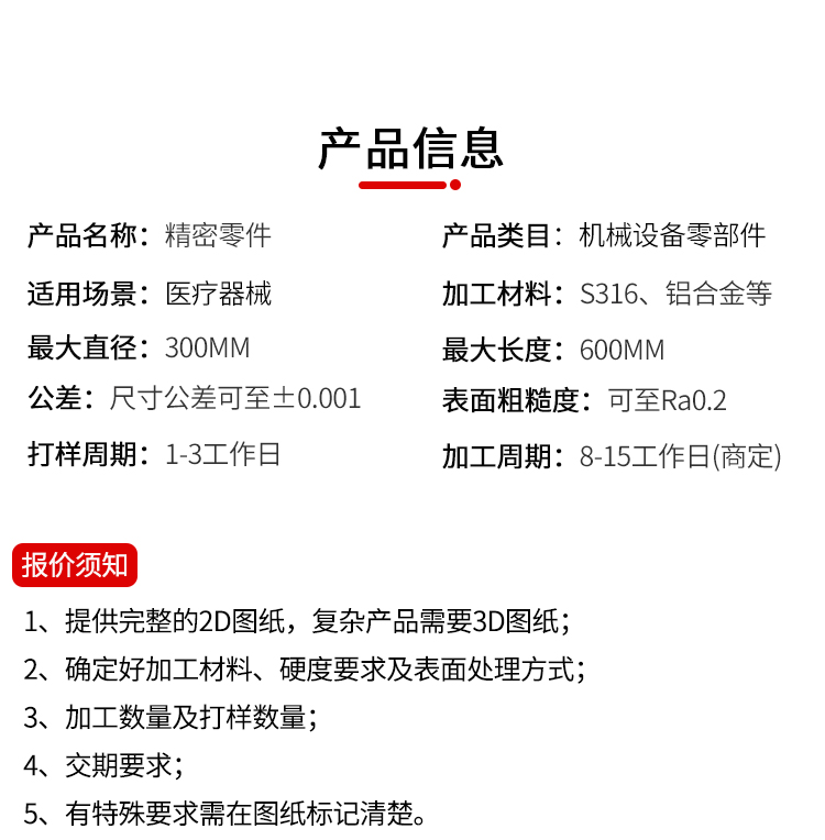 Machining type: CNC, CNC turning, polishing Processing accuracy: Finishing Processing materials: SKH51, S316, etc. Maximum diameter: 300 Maximum length: 600 (depending on product complexity) Tolerance: ±0. 001 Surface roughness: Ra0 樱花视频. 05 Proofing cycle: 1-3 days Processing cycle: 7-15 days (complex products cycle agreed) Maximum annual processing capacity: 7,000,000 sets.