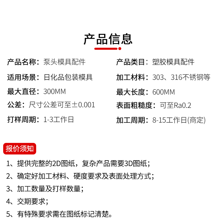 机加工类型: CNC、数控车、平面磨 加工精度: 精整加工 加工材料: SKH51、S316等 最大直径: 300 最大长度: 600(依产品复杂程度而定) 公差: ±0. 001 表面粗糙度: Ra0. 05 打样周期:1-3天 加工周期:7-15天(复杂产品周期商定) 年最大加工能力:7000000套 樱花视频.