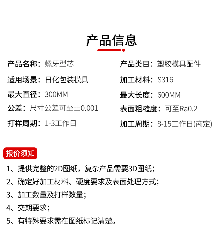 机加工类型: CNC、数控车床 加工精度: 精整加工 加工材料: SKH51、S316等 最大直径: 300 最大长度: 600(依产品复杂程度而定) 公差: ±0. 001 表面粗糙度: Ra0. 05 打样周期:1-3天 加工周期:7-15天(复杂产品周期商定) 年最大加工能力:7000000套 樱花视频.