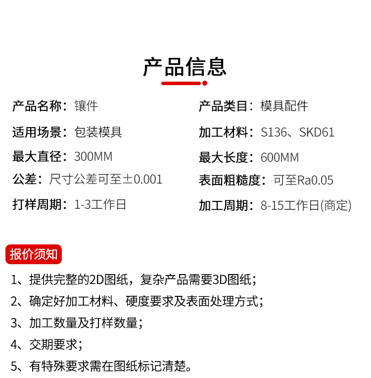 机加工类型: CNC、数控车、平面磨、镜面放电 加工精度: 精整加工 加工材料: SKH51、S316等 最大直径: 300 最大长度: 600(依产品复杂程度而定) 公差: ±0 樱花视频. 001 表面粗糙度: Ra0. 05 打样周期:1-3天 加工周期:7-15天(复杂产品周期商定) 年最大加工能力:7000000套.