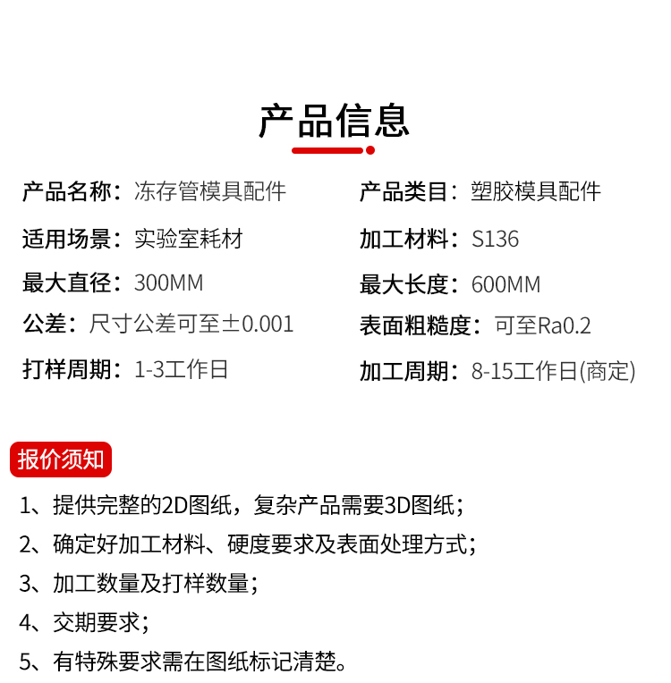 机加工类型: CNC加工、镜面放电 加工精度: 精整加工 加工材料: 304、316、316L等 最大直径: 300 最大长度: 600(依产品复杂程度而定) 公差: ±0. 001 表面粗糙度: Ra0. 05 打样周期:1-3天 加工周期:7-15天(复杂产品周期商定) 年最大加工能力:7000000套 樱花视频.