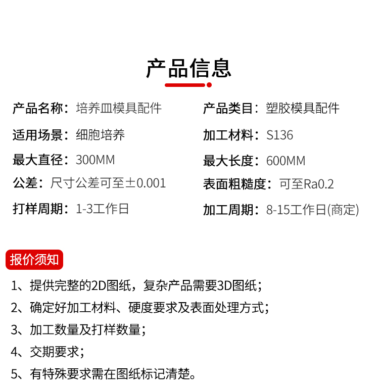 机加工类型: CNC数控加工,镜面放电、平面磨 加工精度: 精整加工 加工材料: 304、S316等 最大直径: 300 最大长度: 600(依产品复杂程度而定) 公差: ±0,001 表面粗糙度: Ra0 樱花视频,05 打样周期:1-3天 加工周期:7-15天(复杂产品周期商定) 年最大加工能力:7000000套.